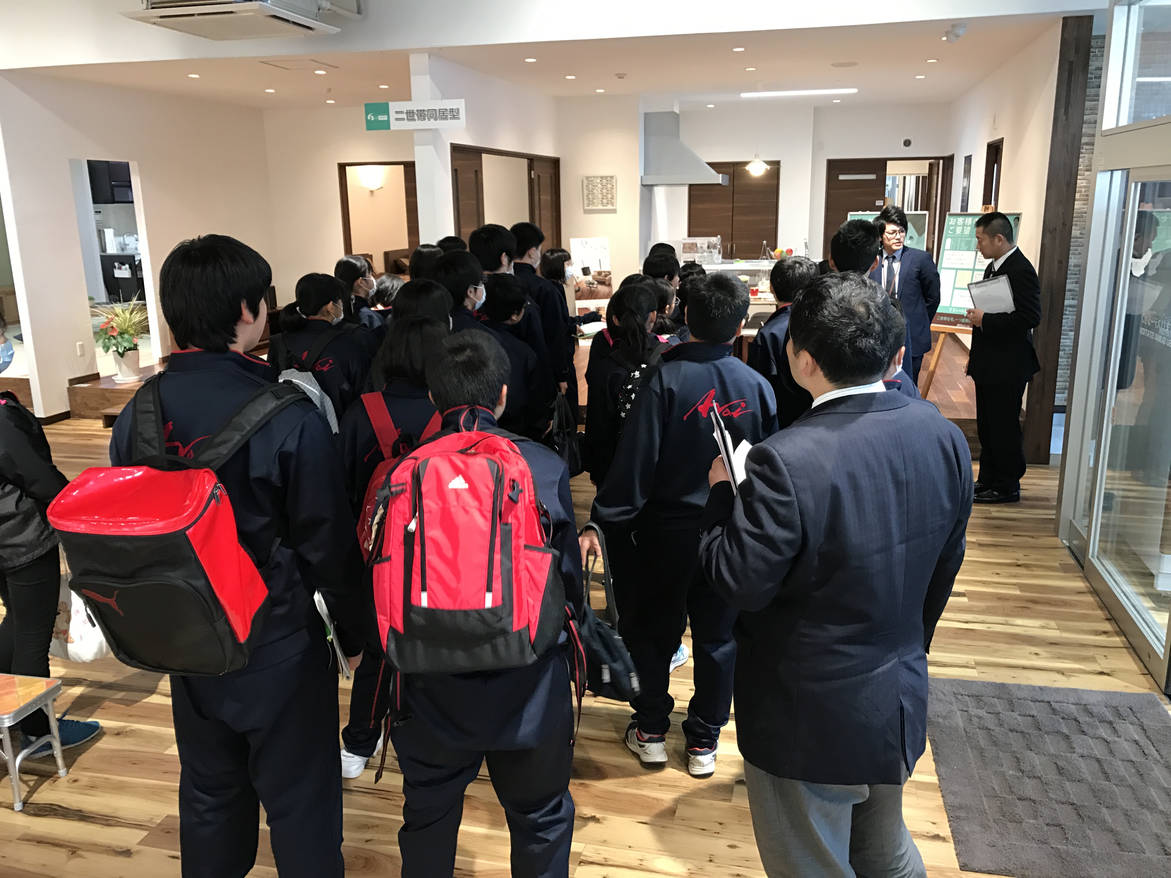 家の土台となる構造材とは違い内法材は常に目に触れる部分となる為、繊細できれいな仕上げが求められます。家’Sハセガワでは精密な機械の技術と、”内法材の魔術師”こと、小林主任のテクニックが合わさって内法材の加工が行なわれているのです!中学生の皆さんも興味津々♪