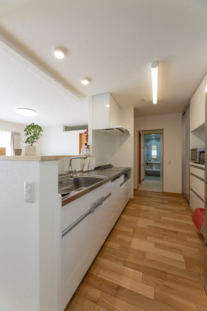 キッチンを中心にダイニングとランドリールームを回遊できる動線にして、毎日の家事がラクになるプランニングとなっております。